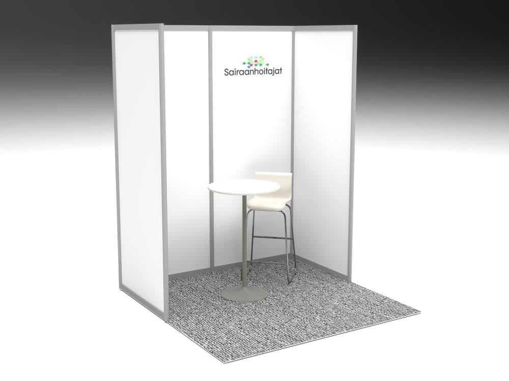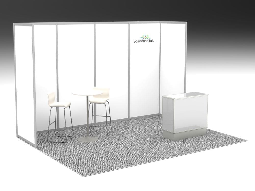 Näyttelypaikkaan sisältyvät tuotteet: 12 m2 tummanharmaa huopamatto aluslevyllä 6 kpl seinäelementti 1000 x 2480, alumiiniprofiili, valkoinen levy 1 kpl logo takaseinään 1 kpl M10 baaritiski 1 kpl baaripöytä 2 kpl baarituoli 1 kpl virtasyöttö 7A